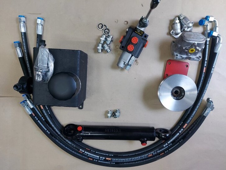 Розглянемо детальніше приклади того, з чого складаються комплект гідравліки на мототрактори. Один із найпоширеніших варіантів – базовий комплект гідравліки на мототрактор для підйому навісного обладнання. До такого комплекту входить шестеренчастий гідравлічний насос, який підключається до двигуна через ремінну передачу або вал відбору потужності. Насос створює необхідний тиск у системі, забезпечуючи рух робочої рідини. У комплект також входить односекційний гідророзподільник, який дозволяє оператору керувати підйомом і опусканням обладнання. Гідроциліндр у цьому випадку виконує функцію підйомного механізму, а бак для масла забезпечує зберігання та охолодження робочої рідини.